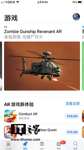 IT之家9月21日消息 ,苹果在9月20日已经正式向用户推送了iOS 11正式版,App Store迎来了重大的更新,不管是版面还是UI相比之前都有很大的改动,版面上取消畅销榜推荐、增加了Today软件的推荐,并且在游戏软件中着重推荐AR游戏,看来全新的App Store也为之后的AR类软件发展格局做出了铺垫。